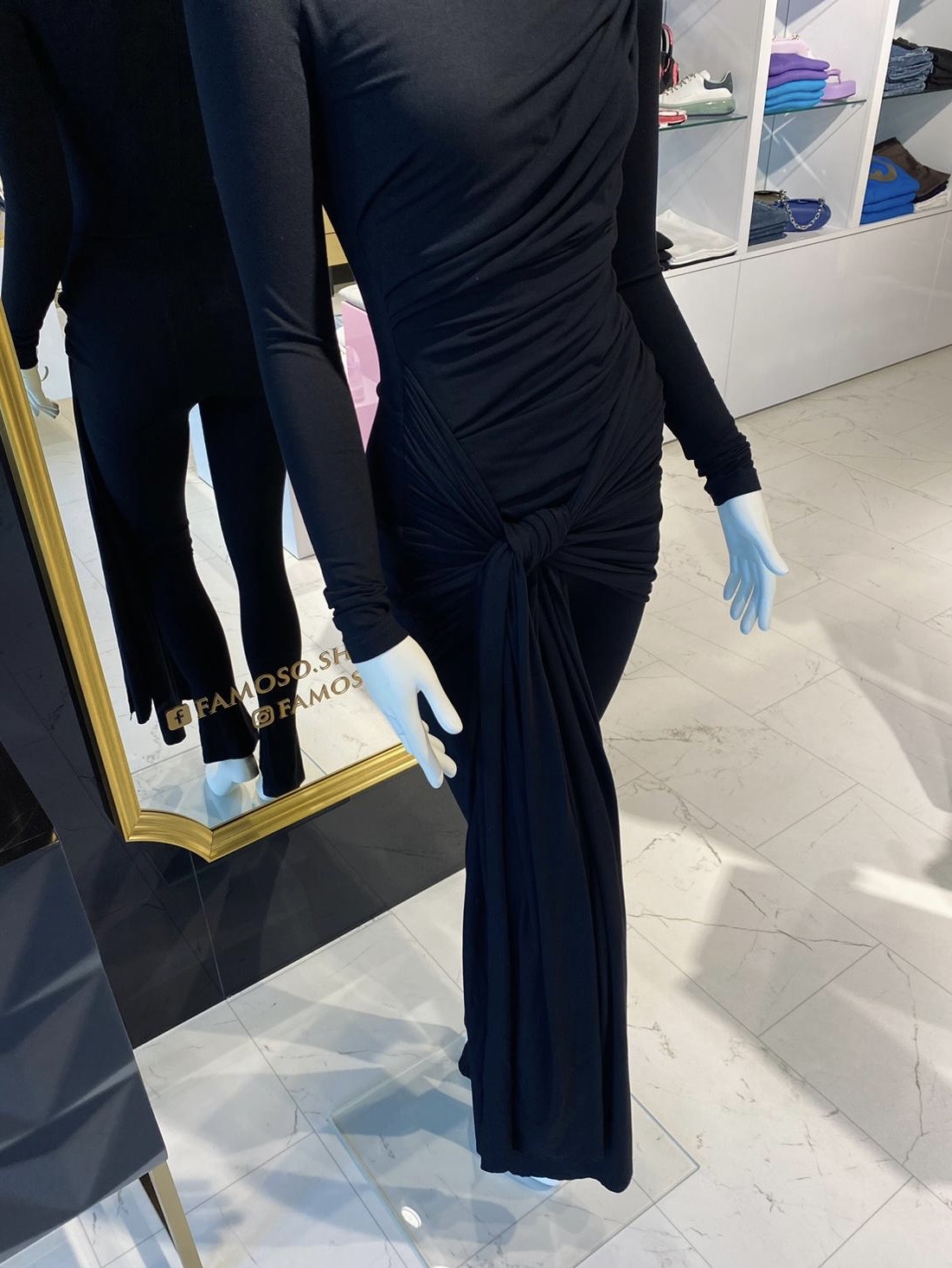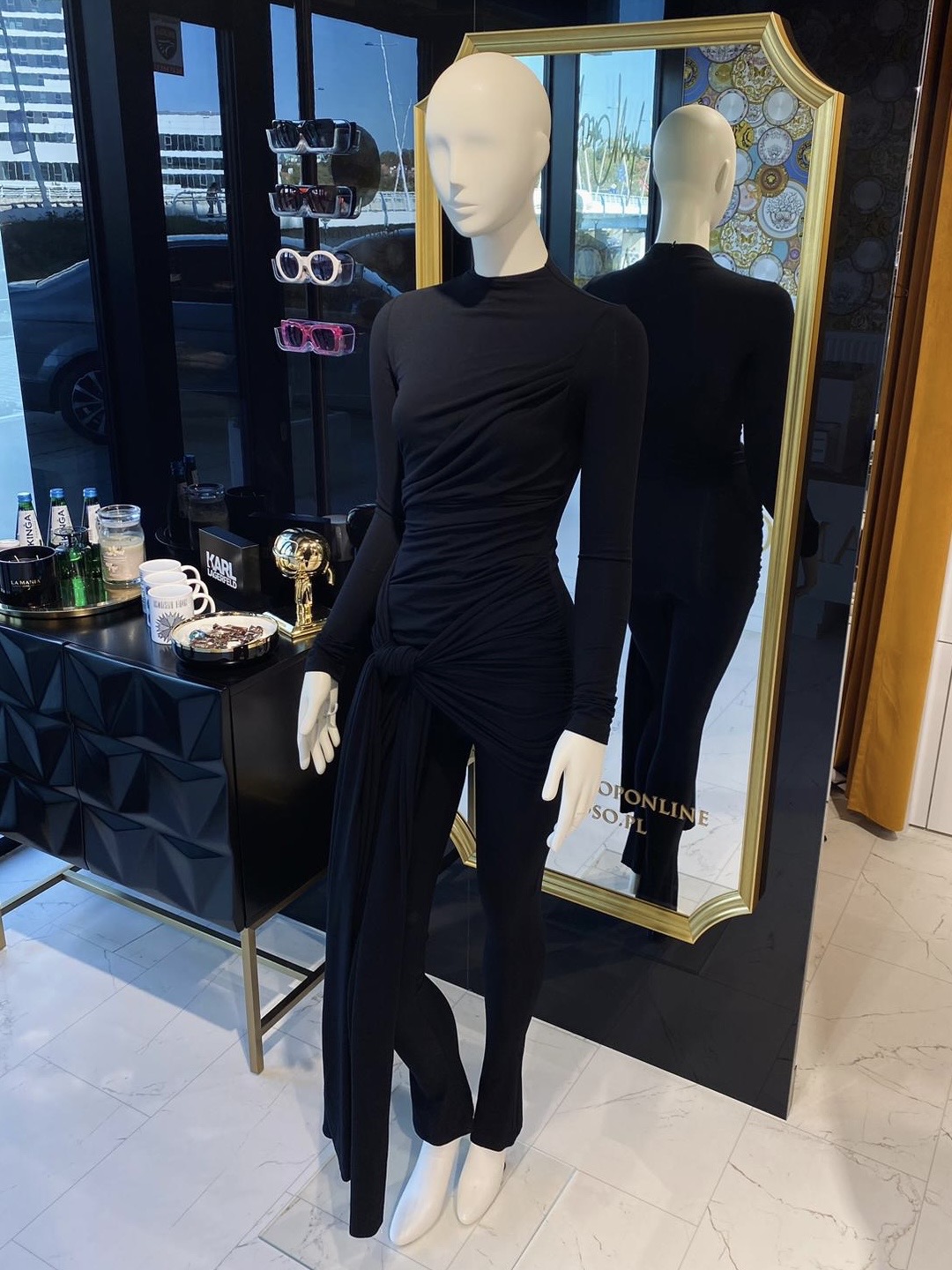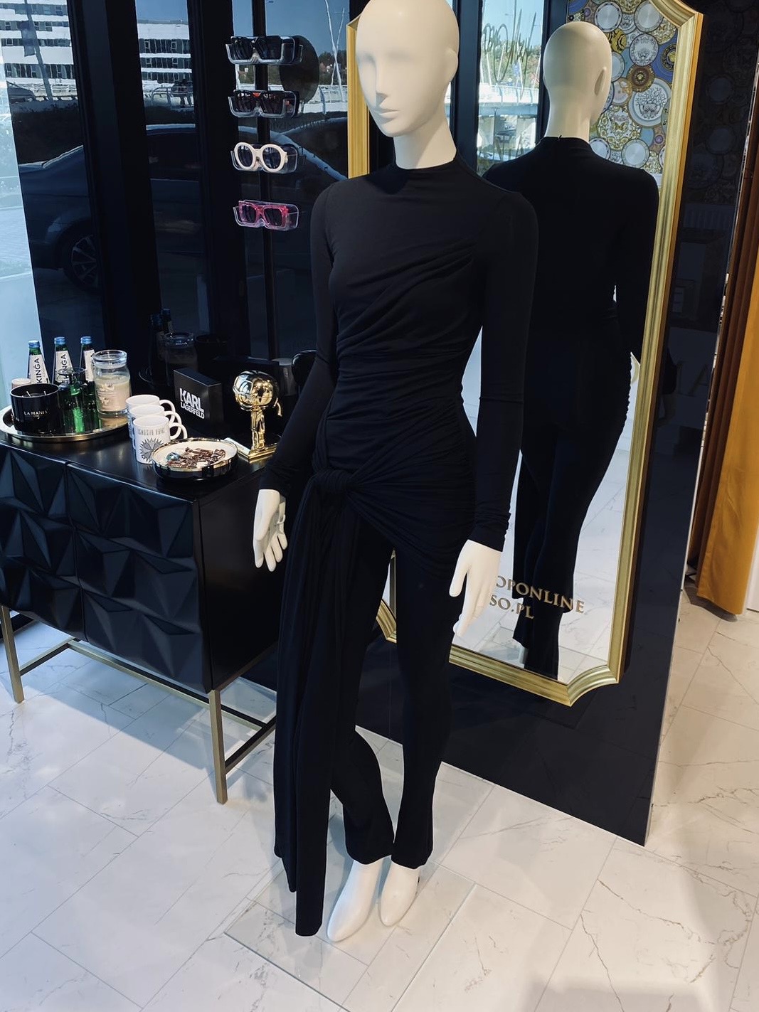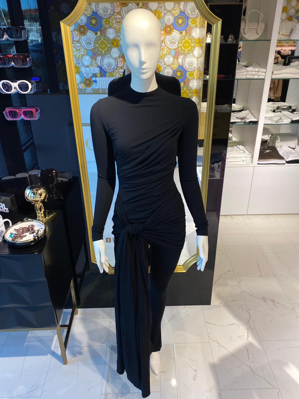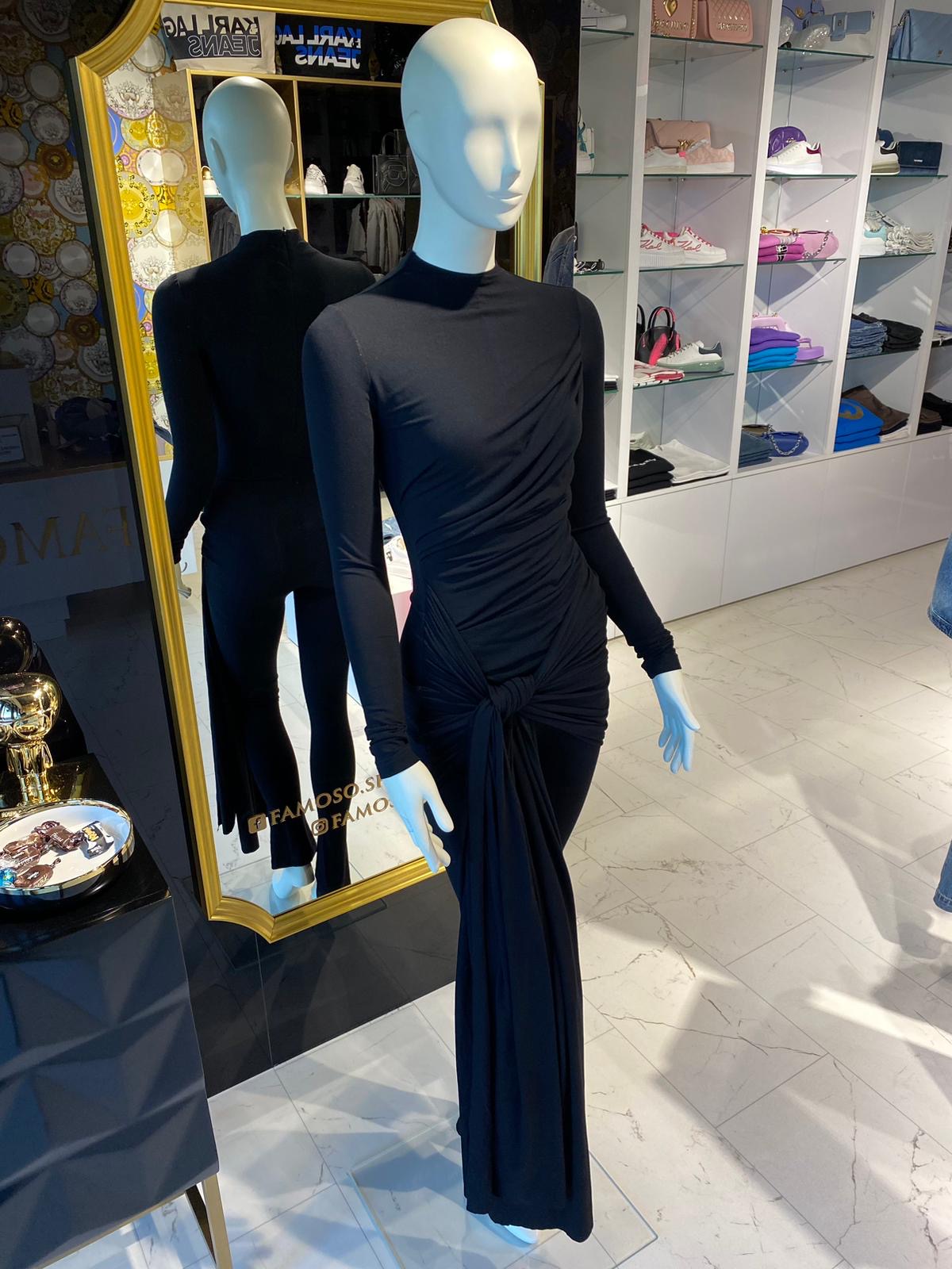 Model wyróżnia się asymetrycznym drapowaniem i efektownym wiązaniem w talii, które nadaje całości wyjątkowego charakteru. Długie rękawy i dopasowane nogawki sprawiają, że kombinezon jest idealny zarówno na wieczorne wyjścia, jak i bardziej formalne okazje.