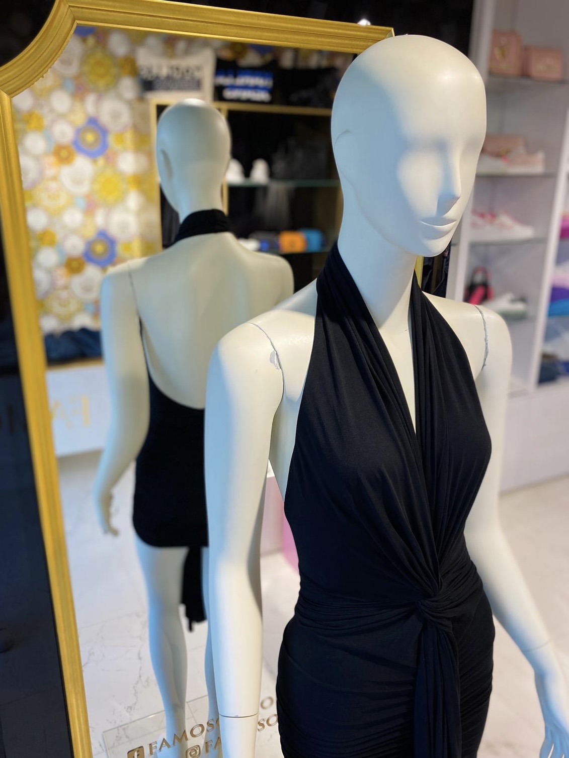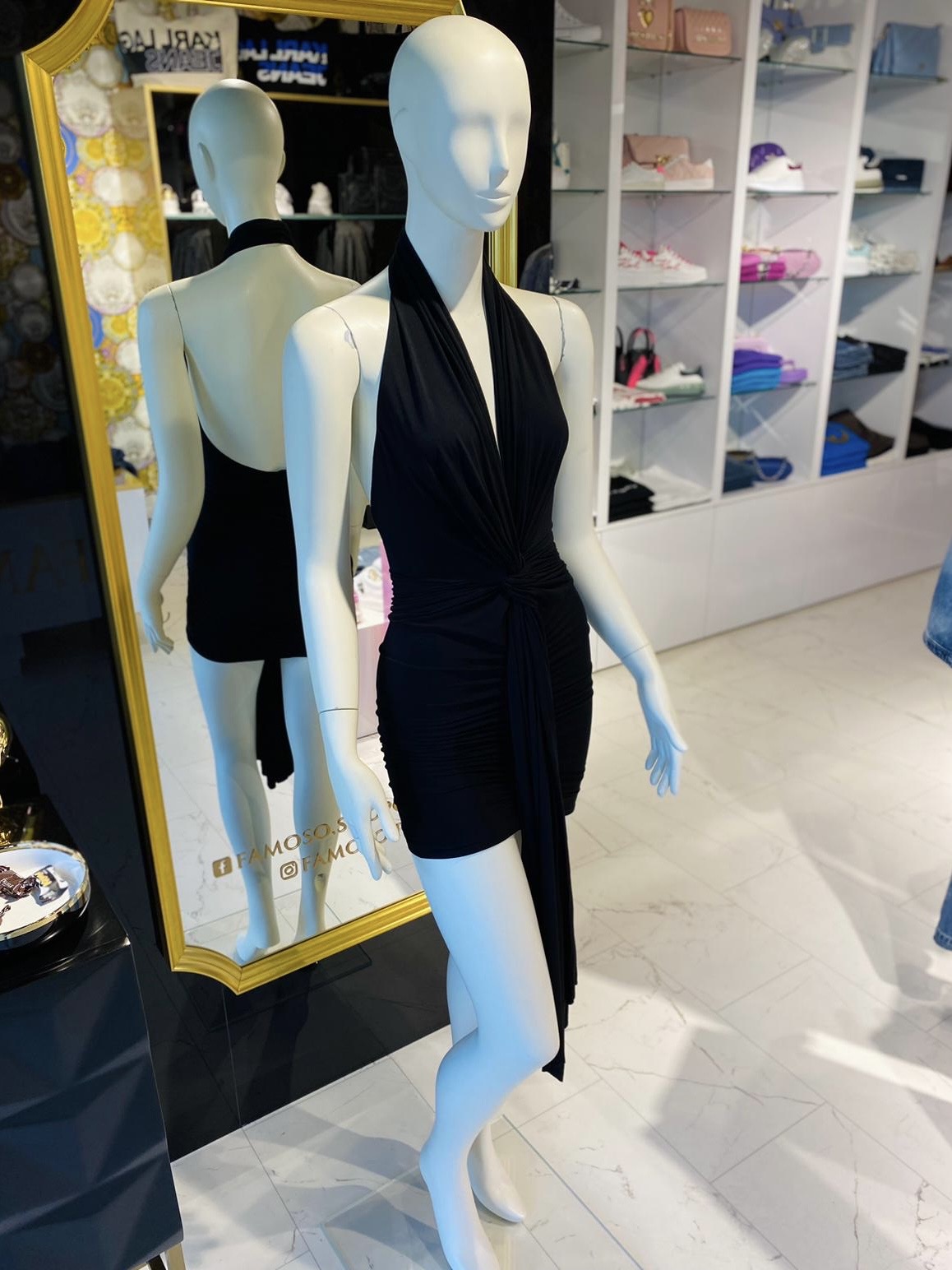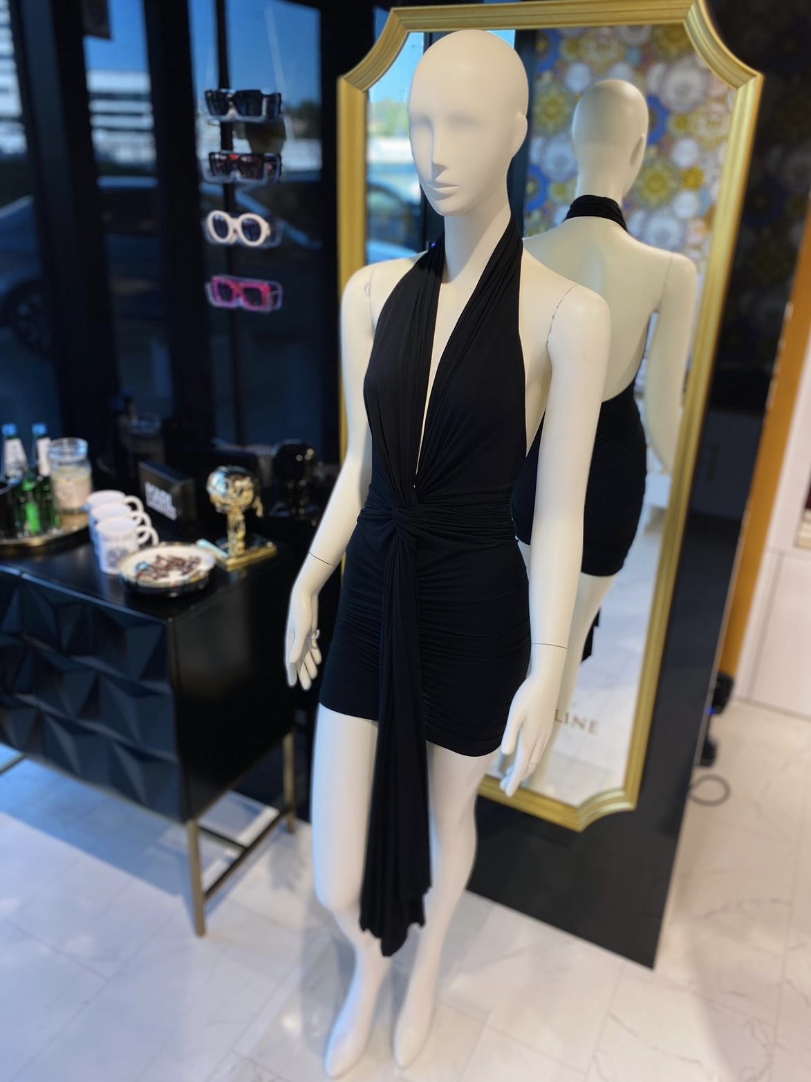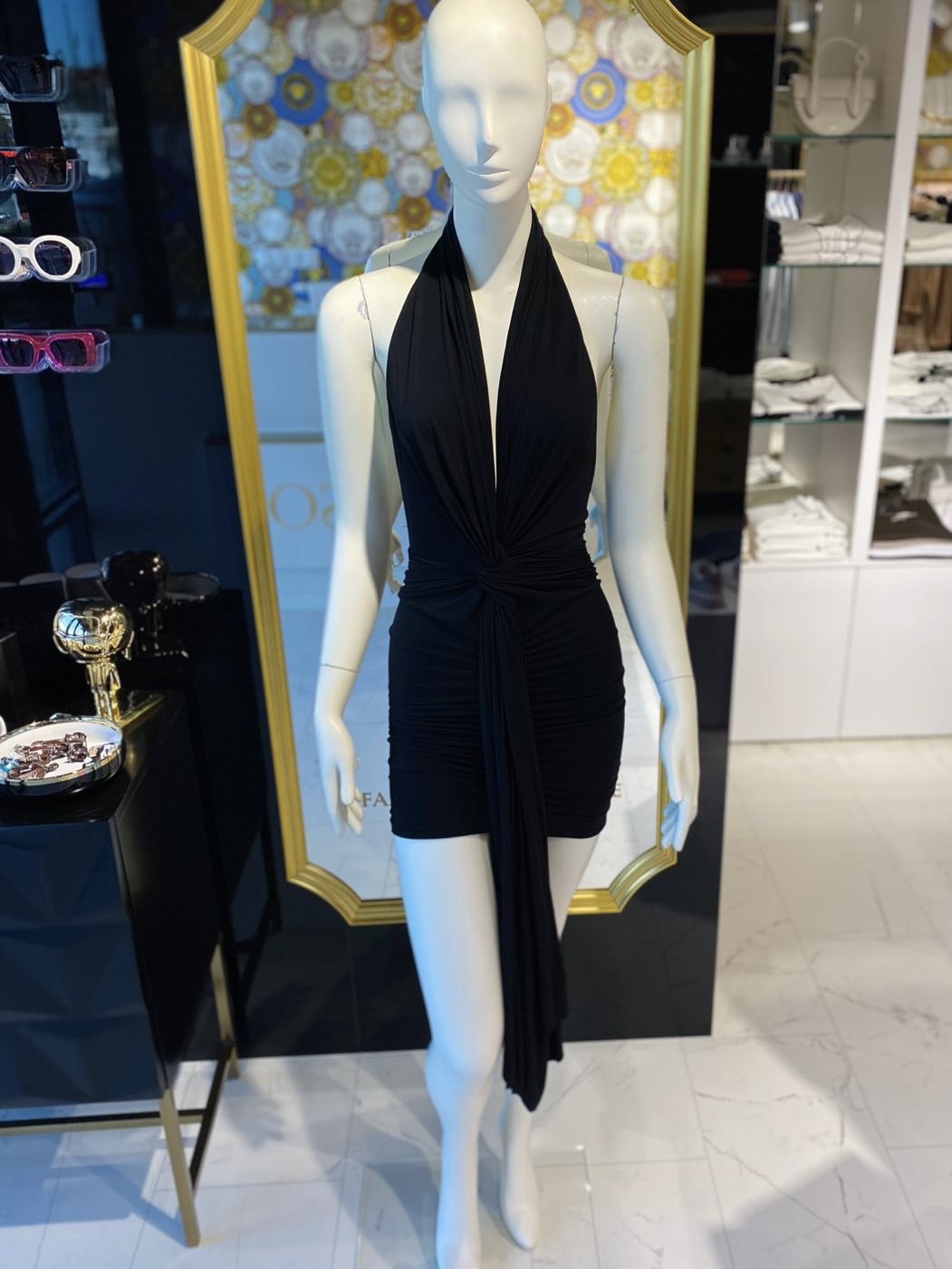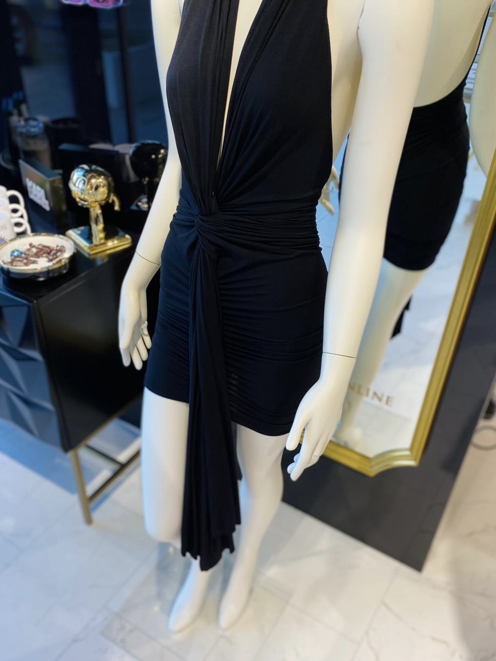 “Regulowany” głęboki dekolt, odkryte plecy i modne wiązanie z przodu.